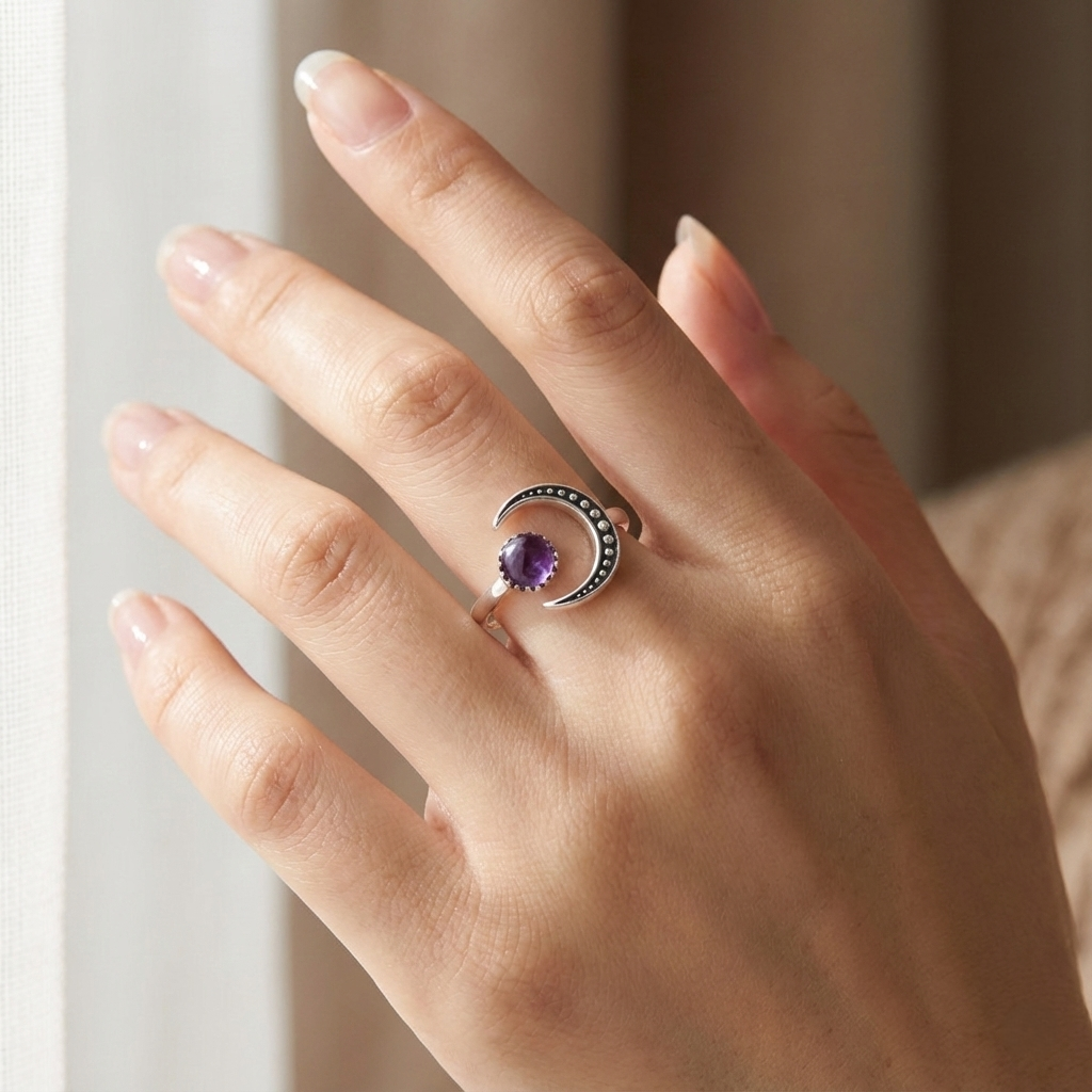 Embrace celestial elegance with this handcrafted Amethyst Crescent Moon Ring, designed for women who love meaningful, statement jewelry. The deep purple natural amethyst gemstone is beautifully cradled within a crescent moon design, symbolizing intuition, protection, and feminine power.